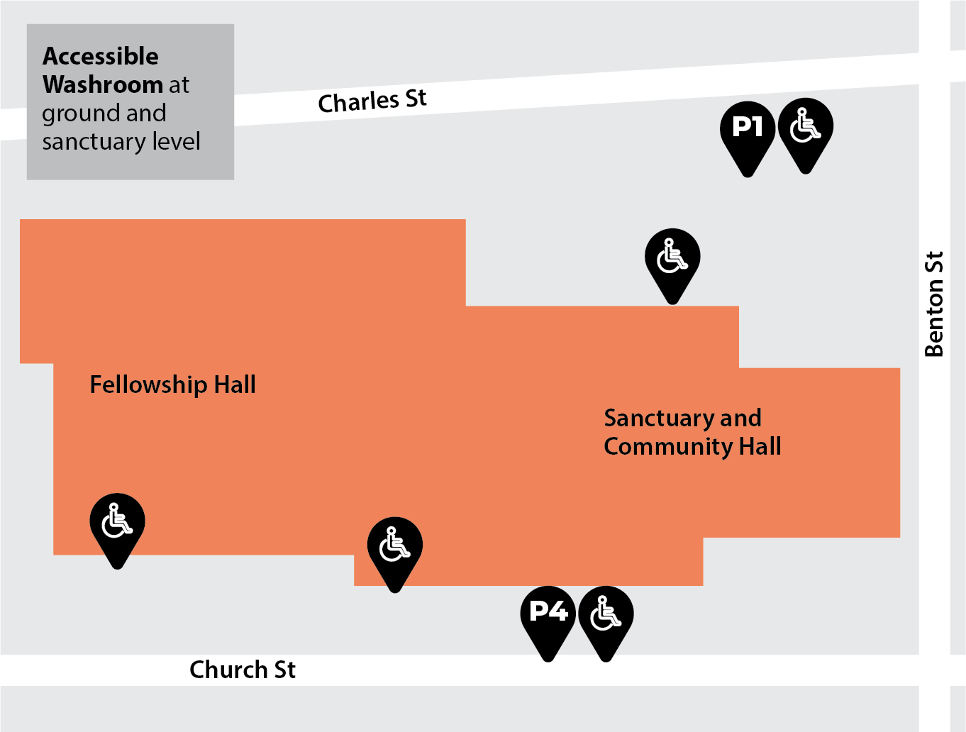 Accessible washrooms are located beside our Fellowship Hall, in our Community Hall, and beside our church office (Sanctuary level).