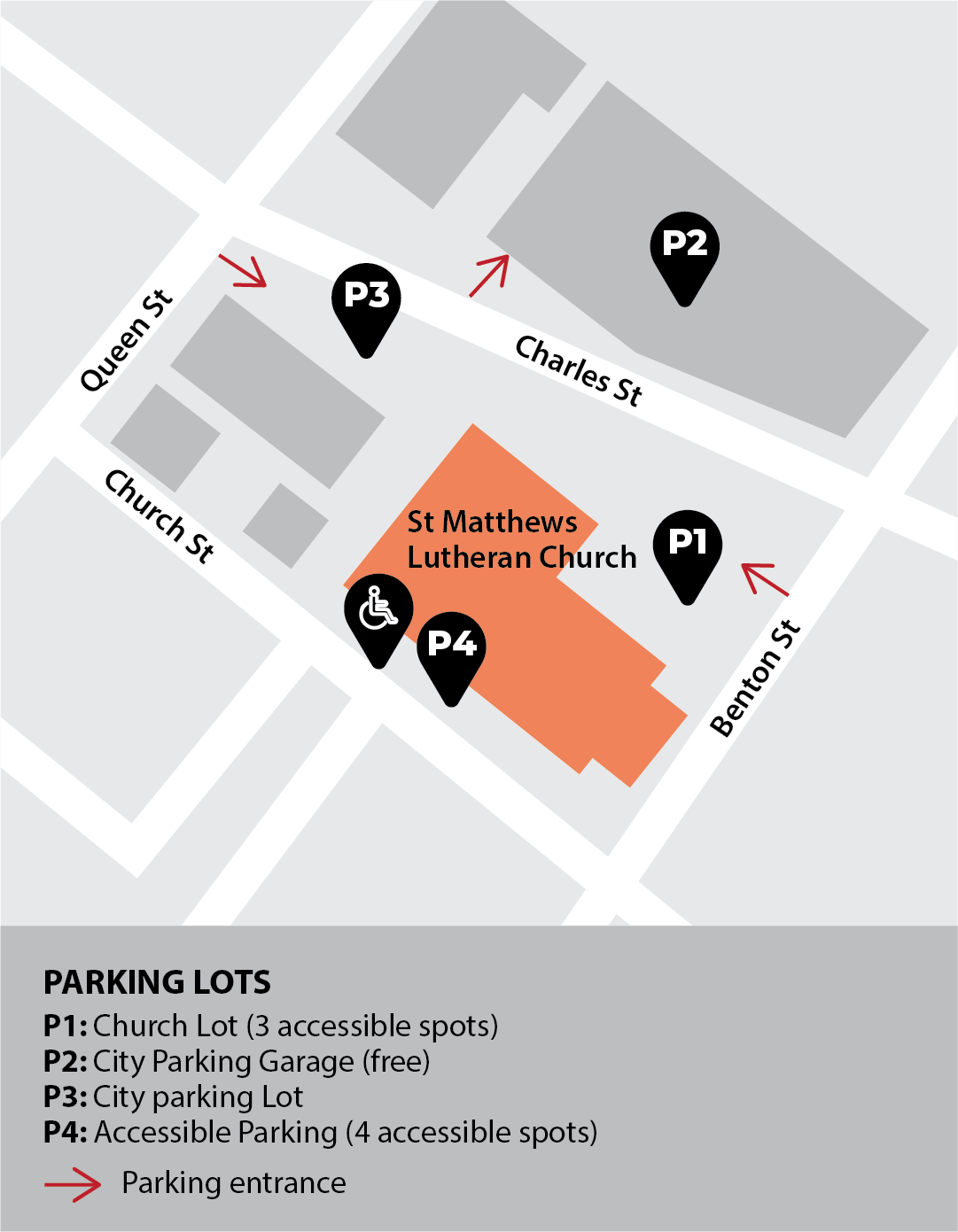 Parking is available in our lot on the corner of Benton and Charles (adjacent to the building). Please do not use the surface parking lot at the corner of Church and Benton. Doing so is at your own risk.